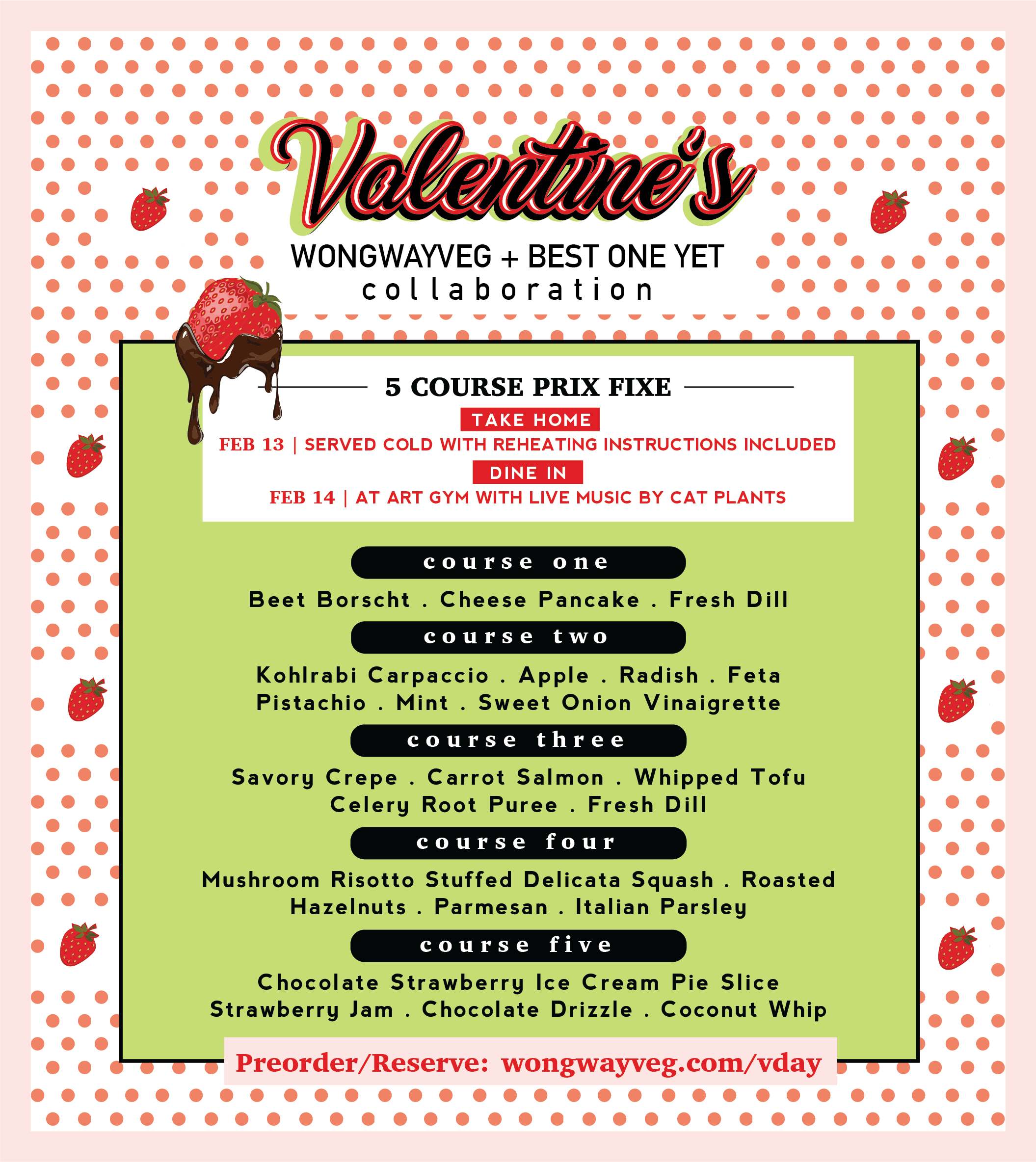 DINE IN: Prix fixe 5-course meal with dessert by Best One Yet! Reserve today and join us for a special Valentine’s Dinner with live music by Cat Plants. (Choice of a private table or a large community table.)